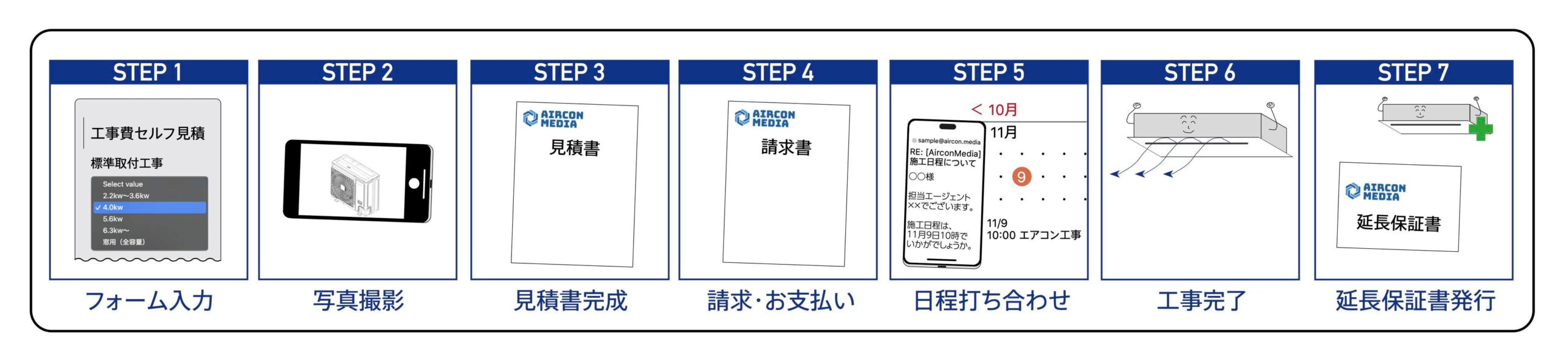 「エアコン本体」+「工事費」=合計金額(見積金額)を算出しますので、「その見積もり金額で良い」ということであれば、工事日の打ち合わせ〜工事という流れになります。