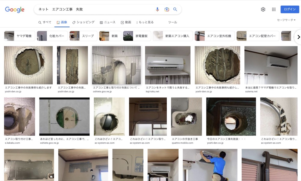 ↑こちらはGoogleで『ネット エアコン工事 失敗』で検索をかけた時の画像です。
