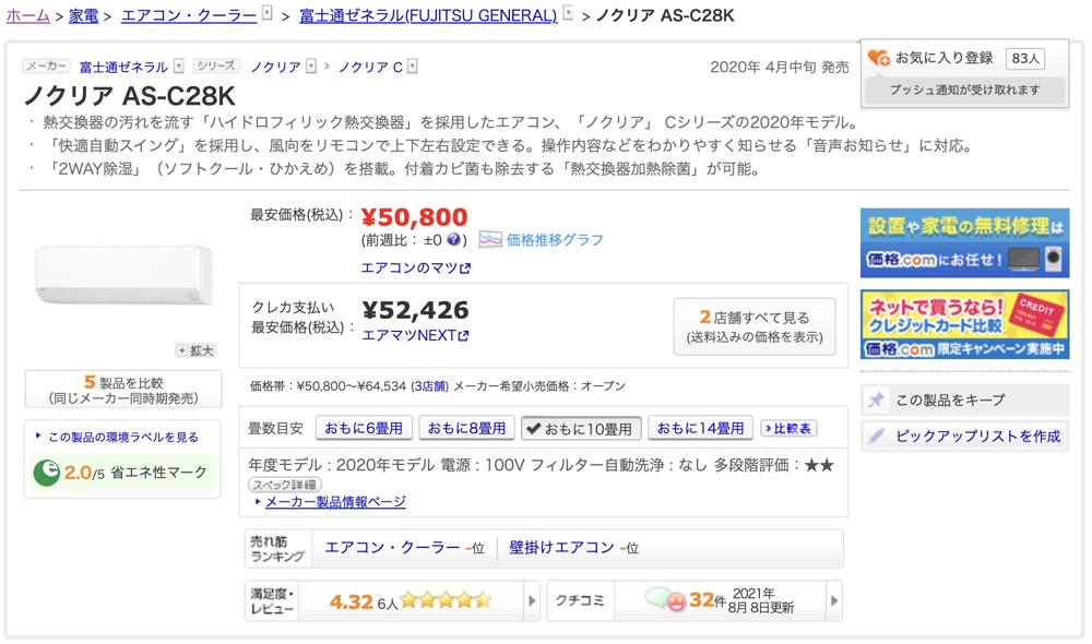 『富士通ゼネラル AS-C28K-W』新品価格50800円