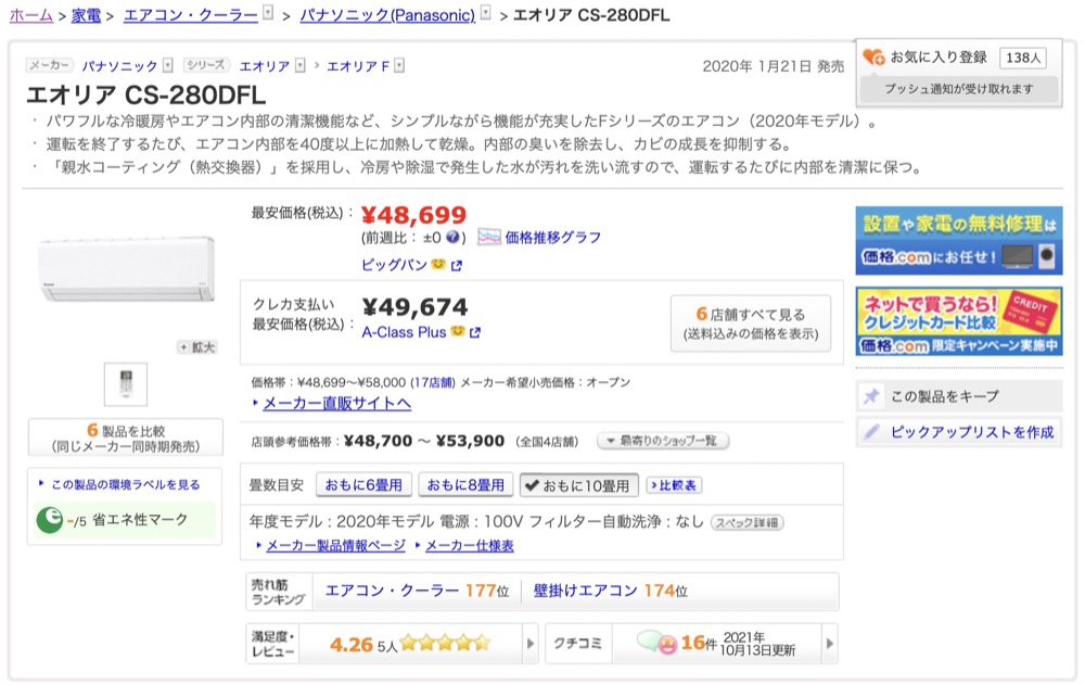 この「1万円前後」というのは、あくまで6畳用の話であって、これが24畳用とかになると2万円くらいになります。