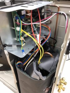 右側には上部に基板、下部に防音材に覆われたコンプレッサー(圧縮機)があります。