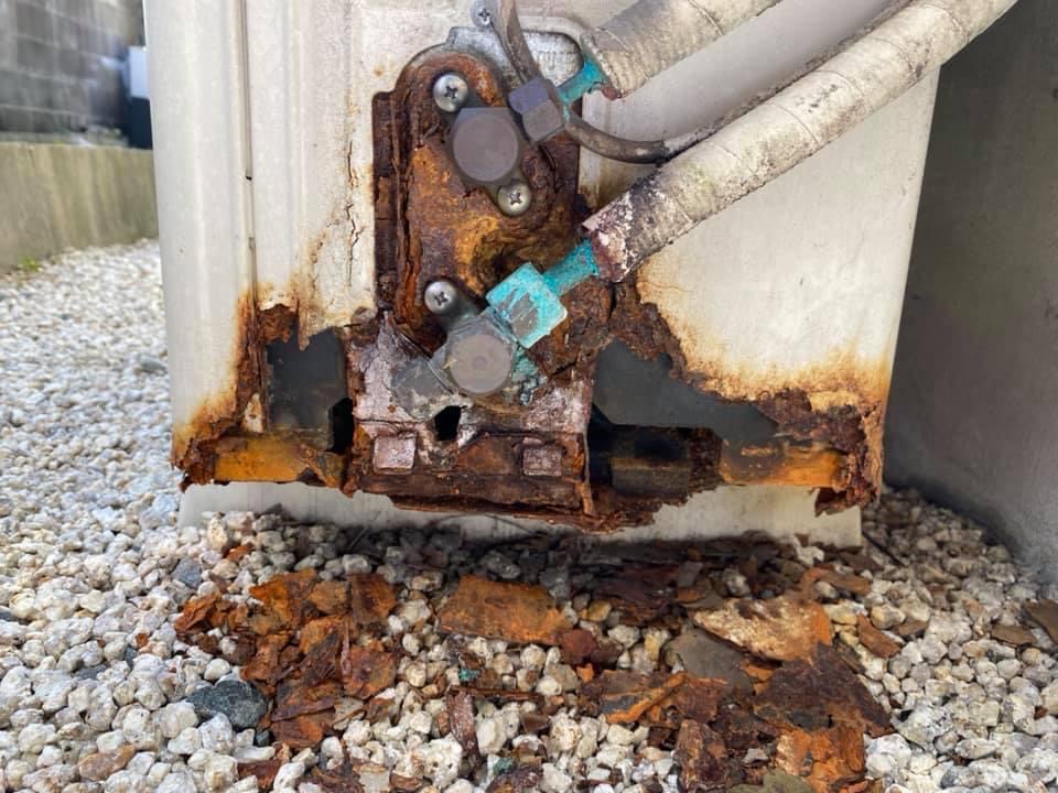 空気中の雰囲気に含まれる塩分が通常よりも早いスピードで室外機を腐食させます。 この塩害の恐ろしいところは、単に錆びて見た目が悪くなるなどというだけでなく、性能に直結した弊害をもたらすところにあります。