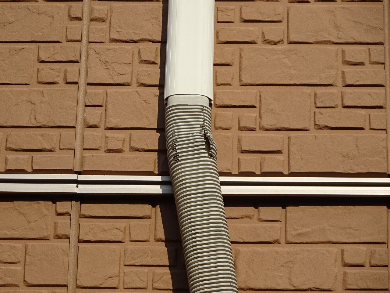 この出っ張りはお家のデザインとしては良いのかもしれませんが、エアコンの配管カバーをつけるときにはものすごく邪魔になります。笑
