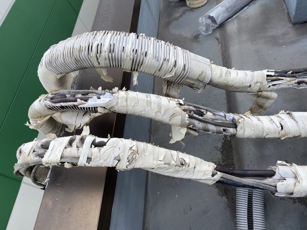 例えば先ほどの写真で見てみると、一番外側に巻いてあるテープがボロボロになり、配管を包んでいる断熱材もボロボロになってしまっています。