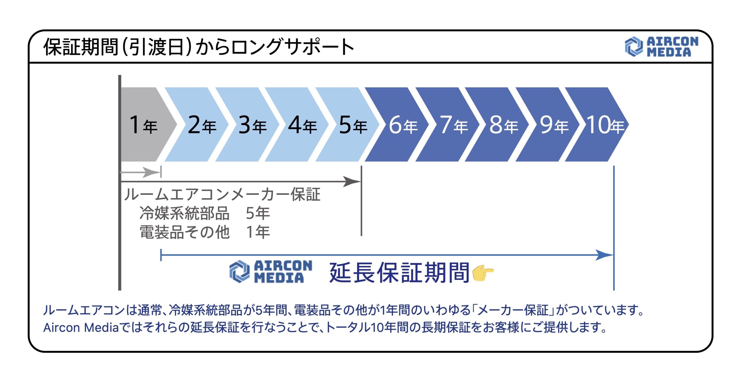 Aircon Mediaの延長保証はメーカー保証期間を超えて同一保証内容を延長継続し万一の際に修理を10年間無償で受けられるサービスを提供しています。
